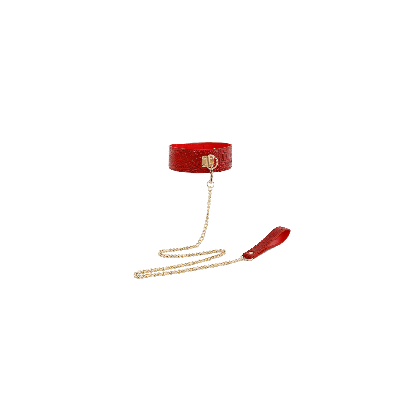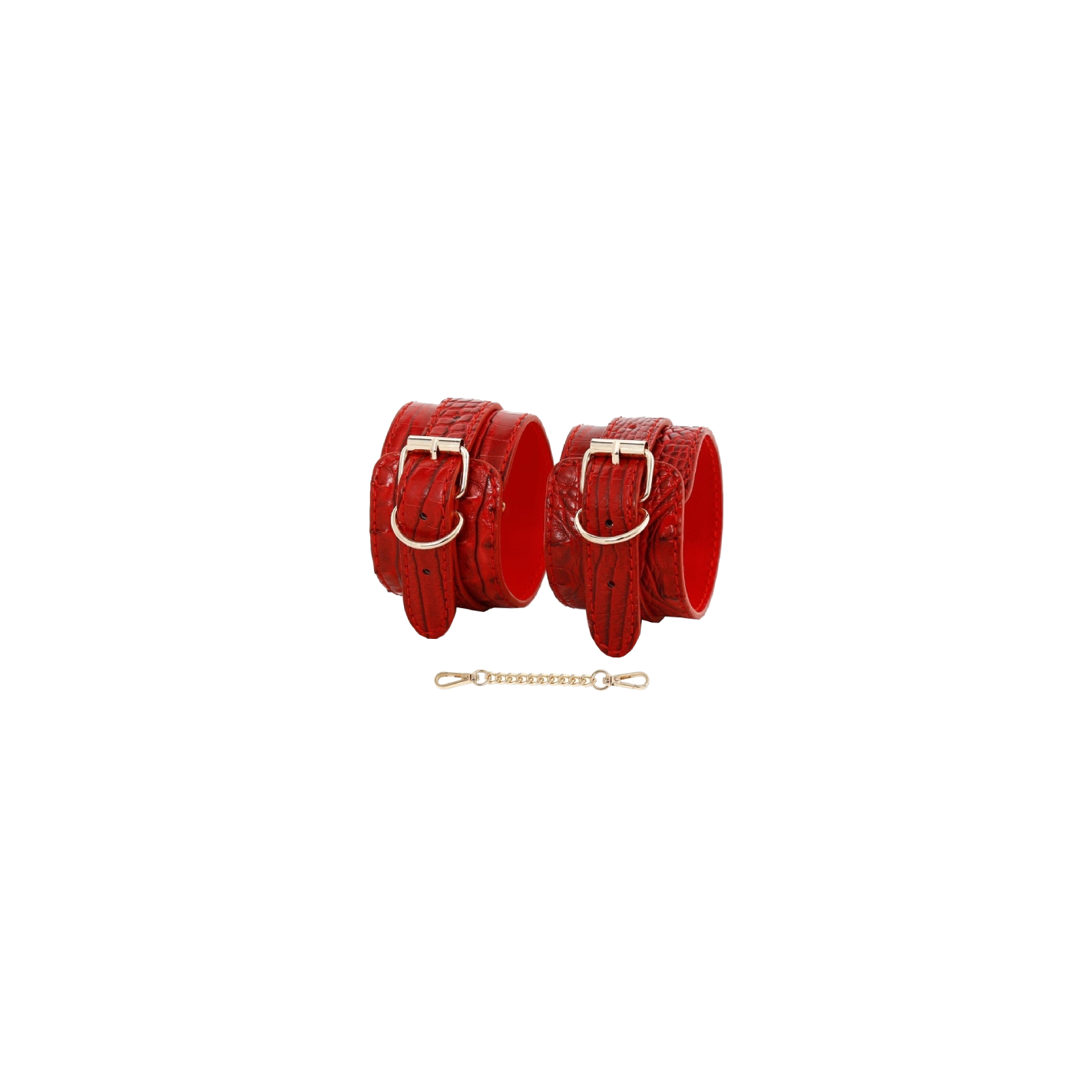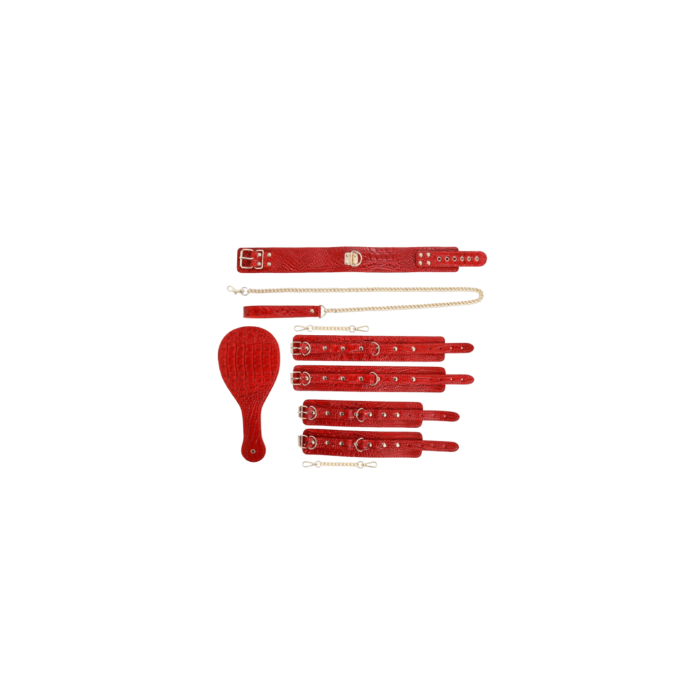 Dans ce coffret, vous trouverez tout l'attirail pour vous essayer aux jeux de rôle, au SM et au bondage, le tout orné d'un imprimé crocodile rouge : une paire de menottes pour chevilles et une pour poignets, une laisse et un collier et un paddle large.